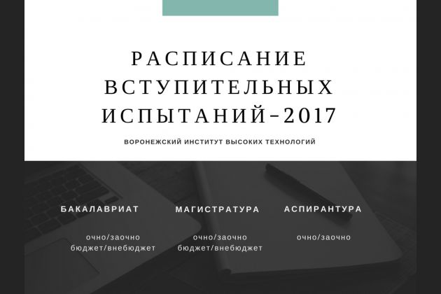 Напоминаем, что все расписания и программы вступительных испытаний для поступления в Воронежский институт высоких технологий вы можете найти на сайте vivt.ru/abitur в разделе Абитуриенту высшего образования - Нормативные документы приемной комиссии вуза - Программы вступительных испытаний и Расписание вступительных испытаний.