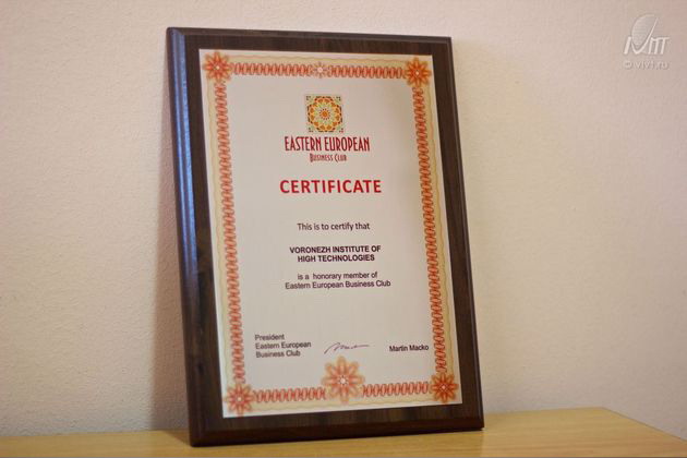Воронежскому институту высоких технологий был вручен сертификат Почетного члена клуба